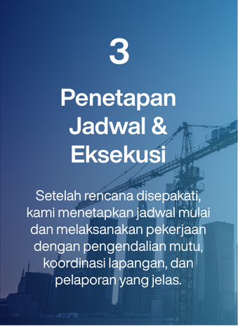 Kami menjalankan setiap proyek dengan pendekatan yang disiplin, mulai dari perencanaan, pengendalian mutu, hingga koordinasi pelaksanaan di lapangan. Setiap pembangunan diarahkan oleh kejelasan lingkup kerja, ketepatan pelaksanaan, serta komitmen terhadap kinerja bangunan dalam jangka panjang.